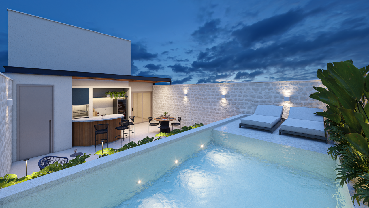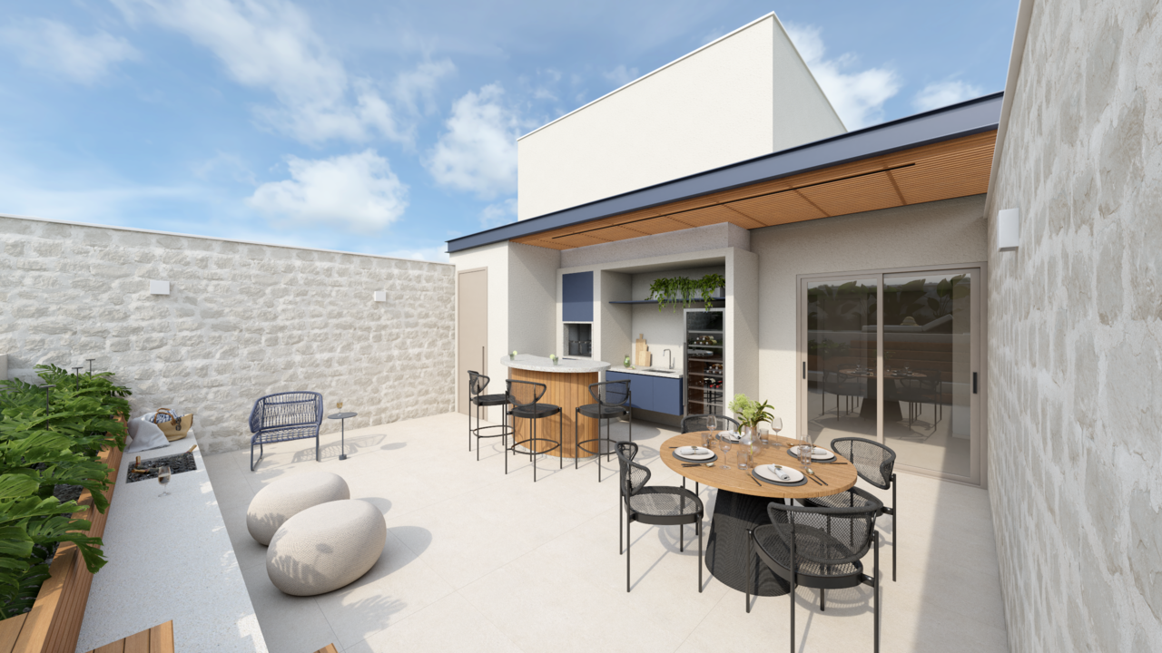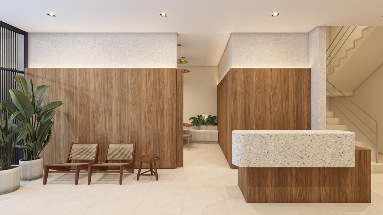 O projeto das áreas comuns do Amaré Arpoados é inspirado nas deslumbrantes paisagens do Rio de Janeiro, utilizando tons claros e formas curvas, aliados a estratégias de iluminação e elementos naturais para criar uma atmosfera sofisticada e descontraída. No Lounge Gourmet, o conceito resgata o uso original do edifício, um histórico clube de bridge, transformando a área em um convite à convivência que evoca a vida boêmia da cidade. O assento contínuo, com suas formas sinuosas, e as luminárias pendentes com iluminação intimista proporcionam conforto e acolhimento. O Rooftop combina materiais naturais e destaca a vegetação ao redor da piscina. A cobertura envidraçada da churrasqueira permite a entrada de luz, que, aliada à iluminação indireta dos jardins, cria uma experiência agradável tanto durante o dia quanto à noite. As formas, texturas e cores são harmoniosamente mantidas nas áreas comuns de todo o empreendimento, promovendo uma unidade sofisticada entre os espaços.