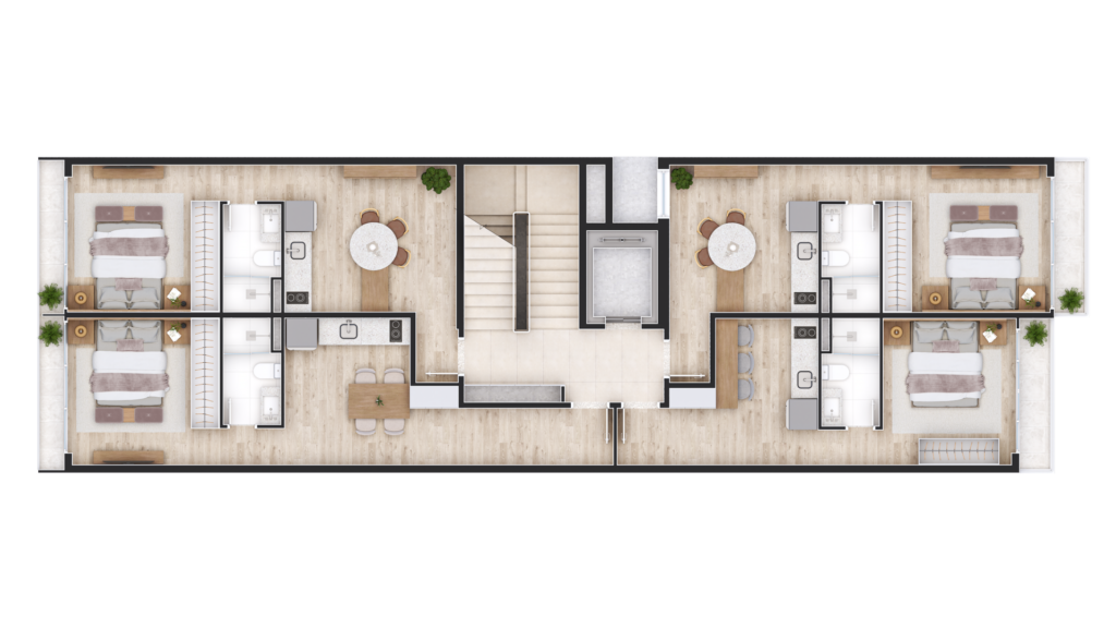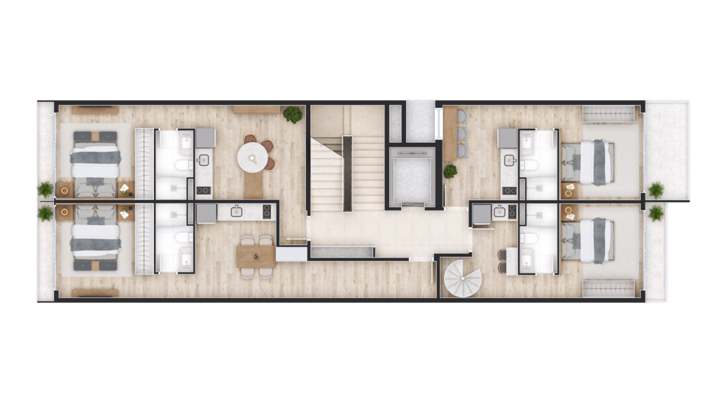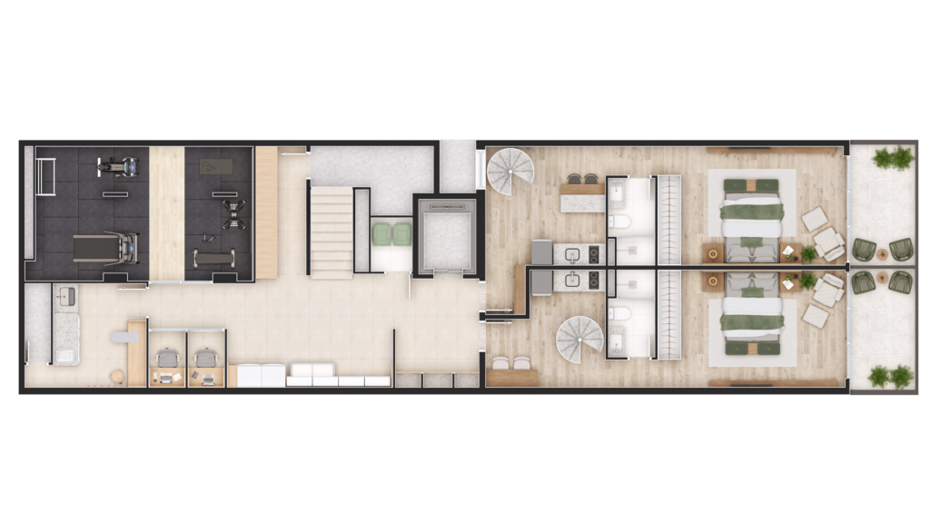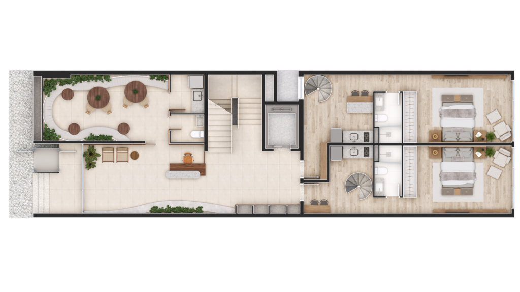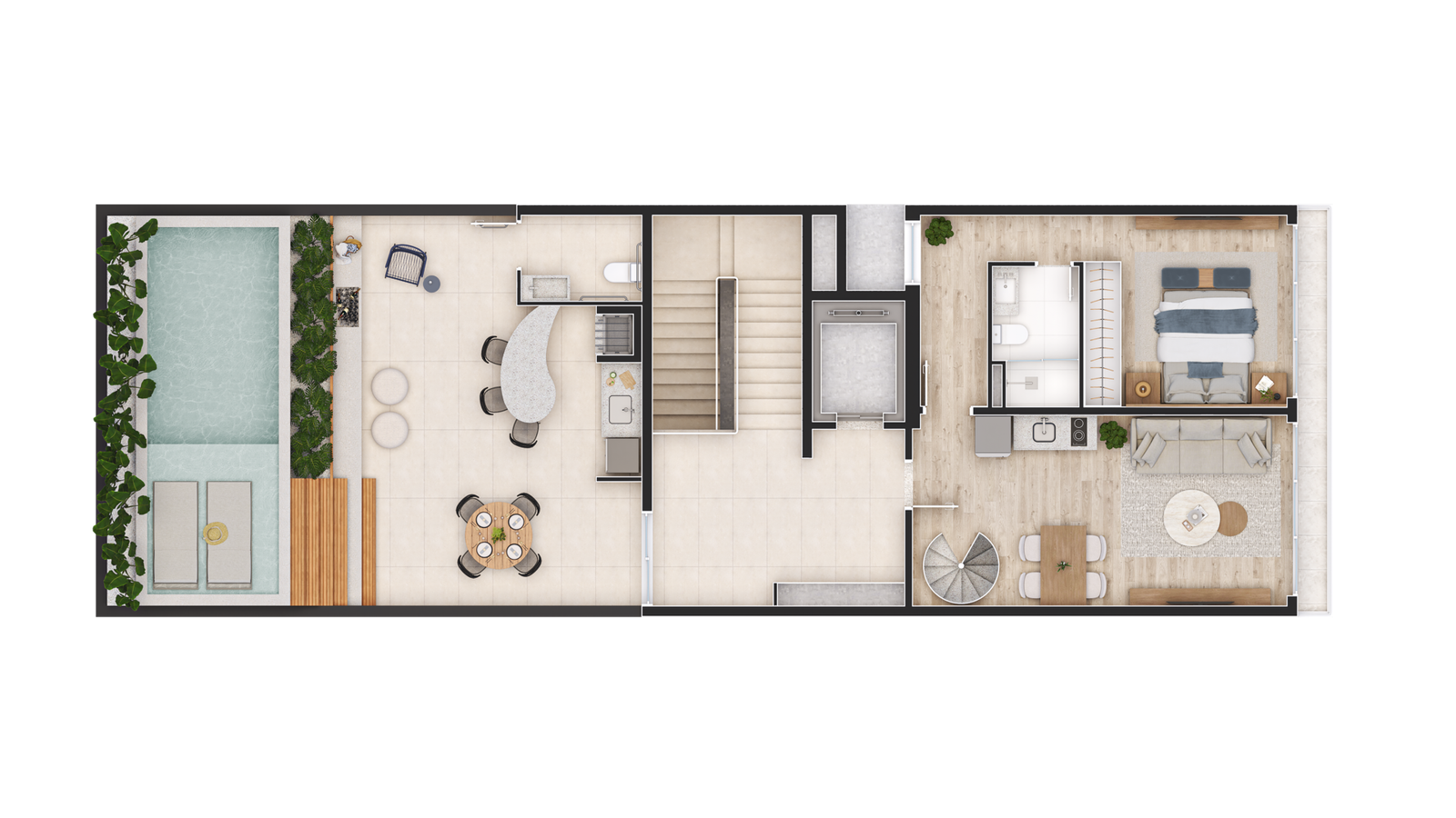 O projeto das áreas comuns do Amaré Arpoados é inspirado nas deslumbrantes paisagens do Rio de Janeiro, utilizando tons claros e formas curvas, aliados a estratégias de iluminação e elementos naturais para criar uma atmosfera sofisticada e descontraída. No Lounge Gourmet, o conceito resgata o uso original do edifício, um histórico clube de bridge, transformando a área em um convite à convivência que evoca a vida boêmia da cidade. O assento contínuo, com suas formas sinuosas, e as luminárias pendentes com iluminação intimista proporcionam conforto e acolhimento. O Rooftop combina materiais naturais e destaca a vegetação ao redor da piscina. A cobertura envidraçada da churrasqueira permite a entrada de luz, que, aliada à iluminação indireta dos jardins, cria uma experiência agradável tanto durante o dia quanto à noite. As formas, texturas e cores são harmoniosamente mantidas nas áreas comuns de todo o empreendimento, promovendo uma unidade sofisticada entre os espaços.
