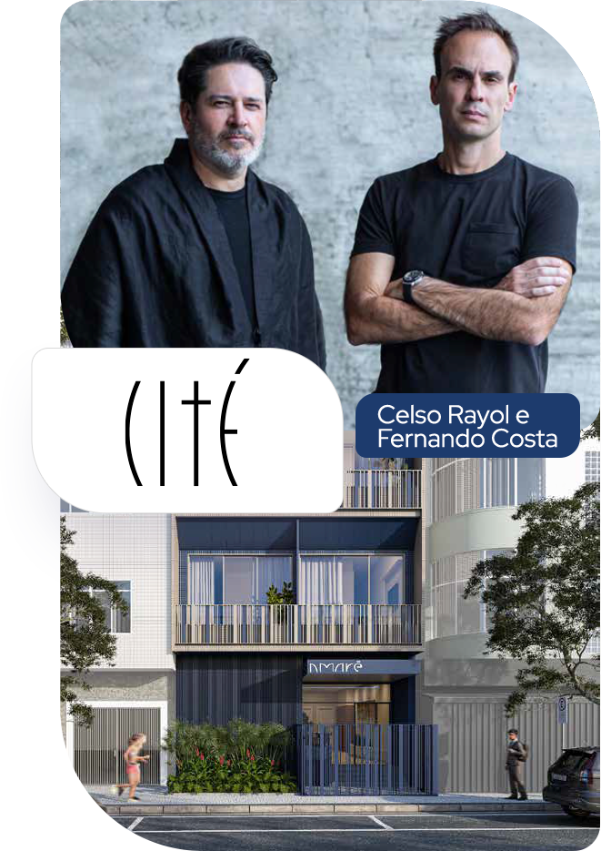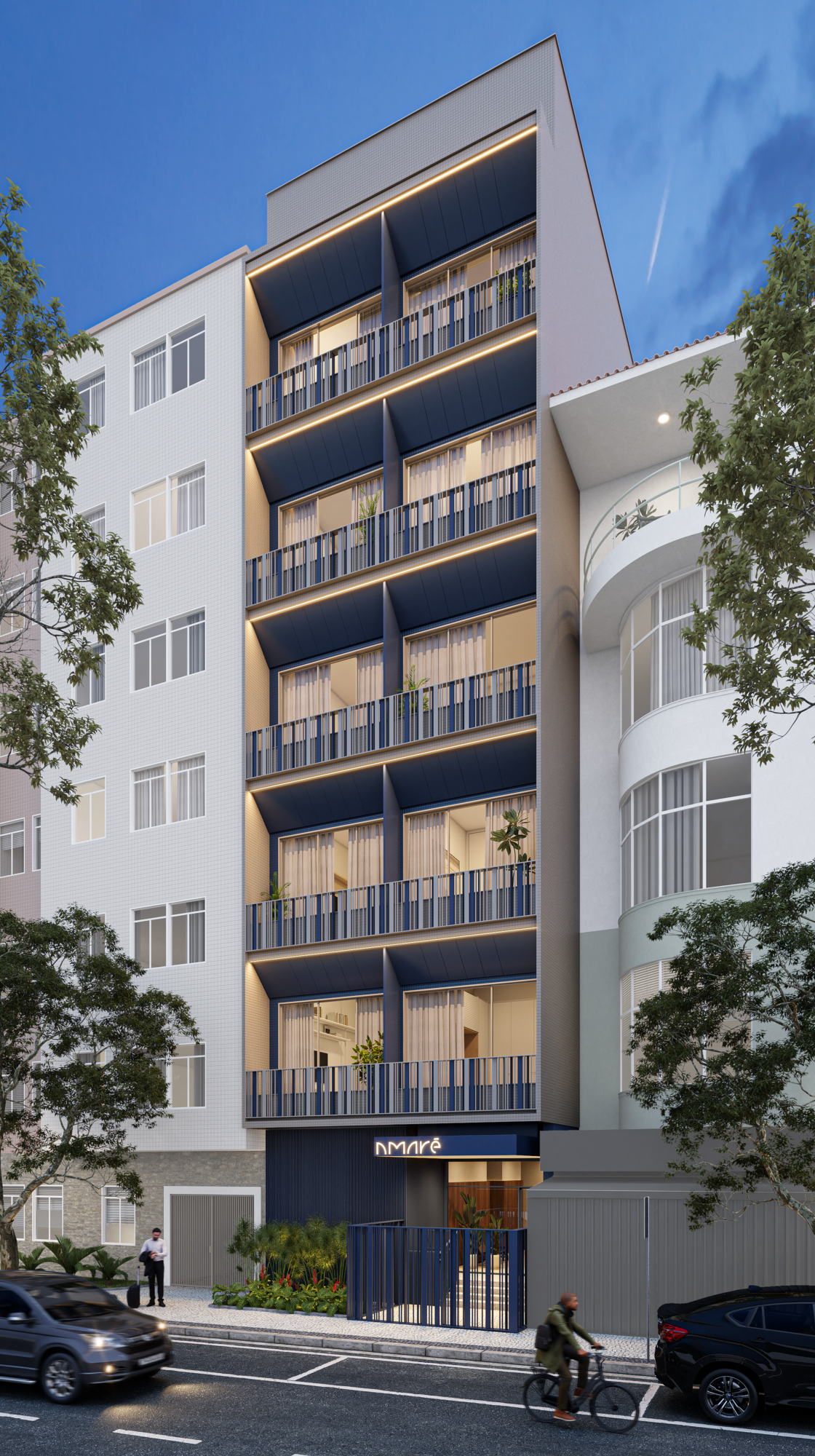 “Para desenvolver a fachada do projeto, partimos do conceito do vai e vem das marés e das surpresas e confusões do baralho, elemento da história dos cassinos e salões de Copacabana, que se mescla com a história do edifício, onde abrigou o clube de bridge por muitos anos. Com um gradil único, o edifício se revela em volumetria e cor conforme andamos pela rua, surpreendendo nos pequenos detalhes. Sobre um fundo neutro, formamos um ritmo de planos e cores em toda a fachada. Ainda adicionamos um volume de azuis especiais no térreo e profundidade às varandas com cor nos tetos. Dessa forma, Amaré se insere num local destacado por surpresas, planos, águas e movimento.”